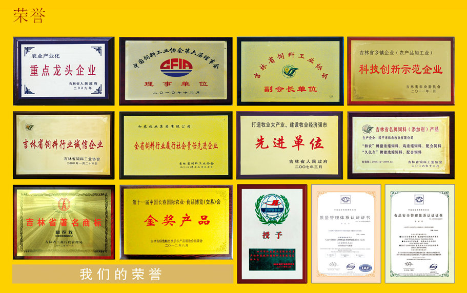集團(tuán)先后被評(píng)為吉林省農(nóng)業(yè)產(chǎn)業(yè)化重點(diǎn)龍頭企業(yè)、牧業(yè)生產(chǎn)先進(jìn)企業(yè)、吉林省飼料行業(yè)誠(chéng)信企業(yè)、吉林省科技創(chuàng)新示范企業(yè)、吉林省科技創(chuàng)新先進(jìn)企業(yè)、吉林省飼料協(xié)會(huì)會(huì)長(zhǎng)單位、中國(guó)飼料工業(yè)協(xié)會(huì)理事單位,“和農(nóng)”品牌榮獲“吉林省名牌飼料產(chǎn)品”與“吉林名牌”稱號(hào)、吉林省著名商標(biāo)。創(chuàng)業(yè)先后通過(guò)了“ISO9001:2008質(zhì)量管理認(rèn)證”和“HACCP食品安全認(rèn)證和農(nóng)乳豬奶料、保育豬配合飼料、蛋王飼料連年榮獲中國(guó)農(nóng)業(yè)食品博覽會(huì)金獎(jiǎng)。