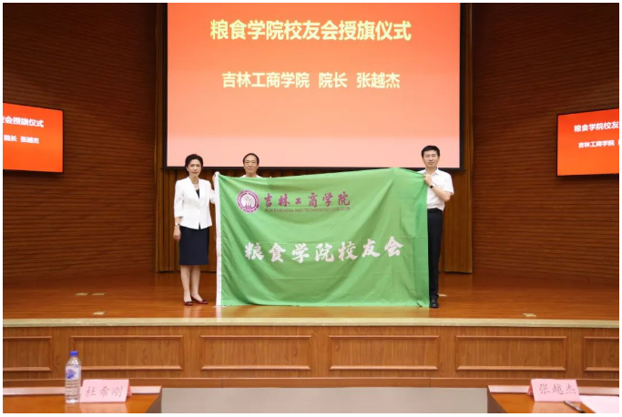 張越杰為糧食學院校友會授旗,吉林省和農牧業(yè)集團董事長方彥明先生。