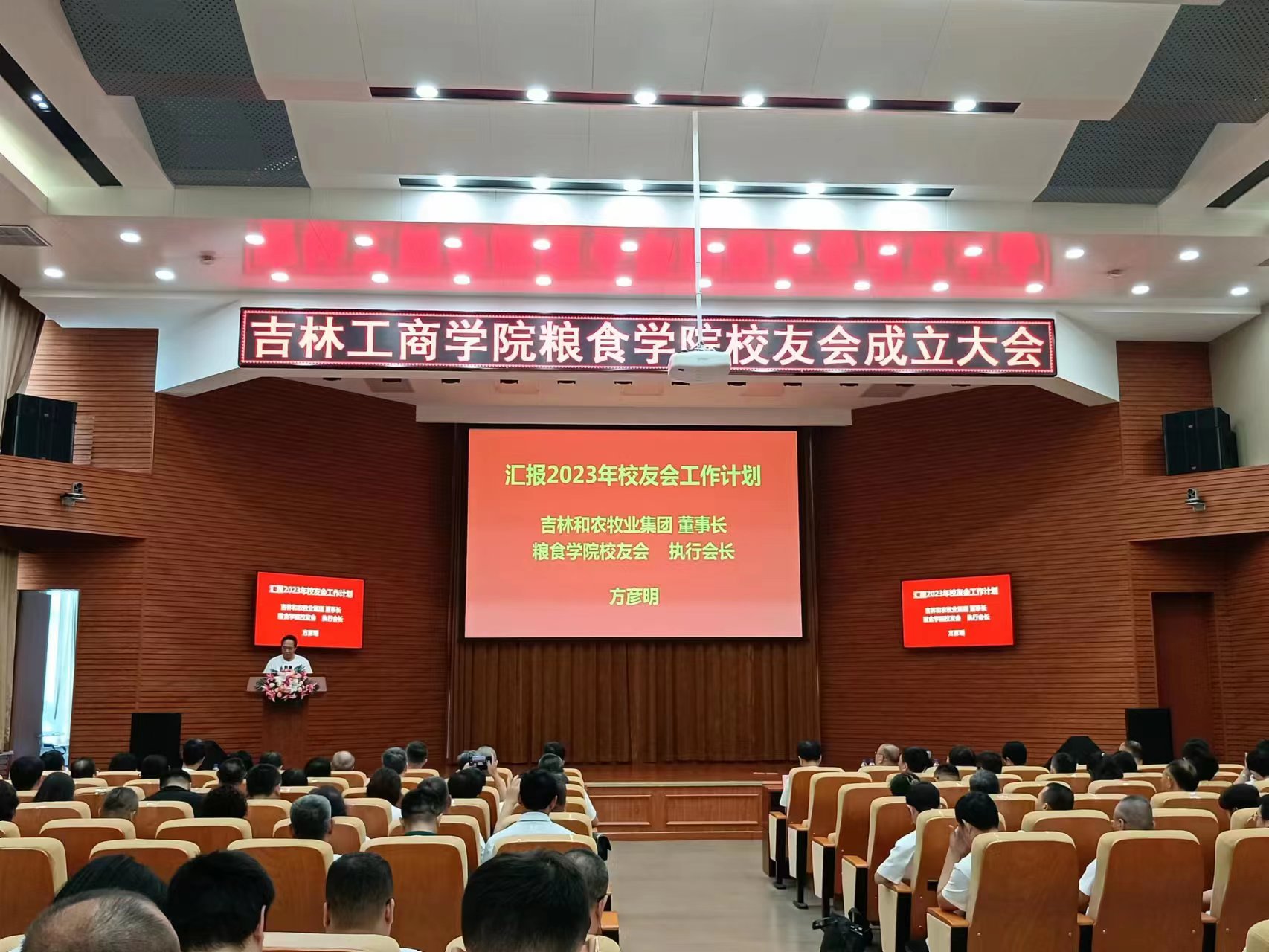 糧食學院校友會執(zhí)行會長、糧食工程專業(yè)8104班校友、吉林省和農牧業(yè)集團董事長方彥明先生向大會匯報糧食學院校友會2023年工作計劃。